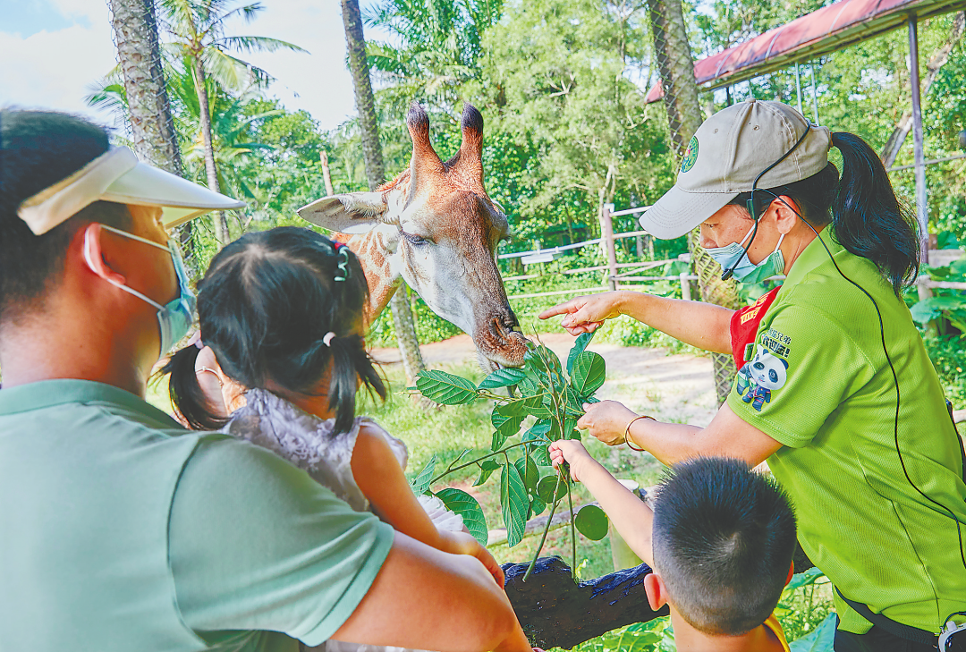 在海南热带野生动植物园,工作人员引导市民游客与长颈鹿互动。封烁 摄 海南热带野生动植物园通过事先倡导、现场引导、加强督导等多种方式践行文明旅游,景区入口处、游客中心均有多名文明旅游志愿者引导游客有序参观、文明观赏动物、禁止自带食物投喂动物,对乱扔垃圾、破坏环境等不文明行为及时进行规劝提醒,广受好评。文昌铜鼓岭景区在游客中心电子屏滚动醒目文明标语,设置专职文明引导员,根据游客好评度调查和景区员工内部投票评选文明旅游服务之星。海口假日海滩旅游区充分利用广播、横幅、LED显示屏、宣传册等多种方式传播文明旅游理念,推出“文明游客”评选活动,引导游客在景区内主动践行文明旅游,营造文明旅游氛围。 来源:阳光海南网微信公众号