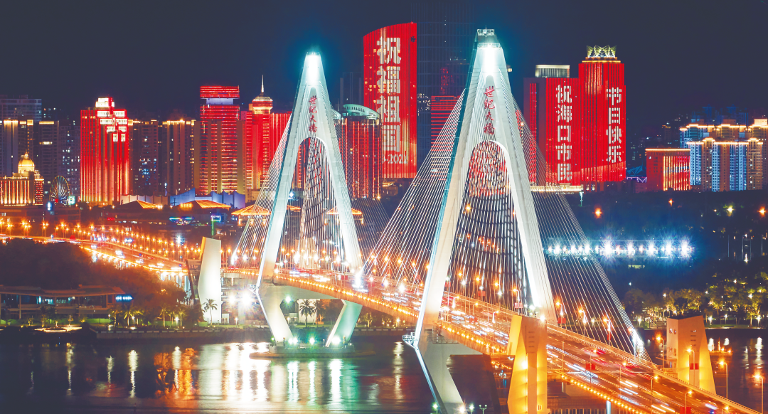 10月1日,海口滨海大道楼宇上演国庆主题灯光秀。封烁 摄