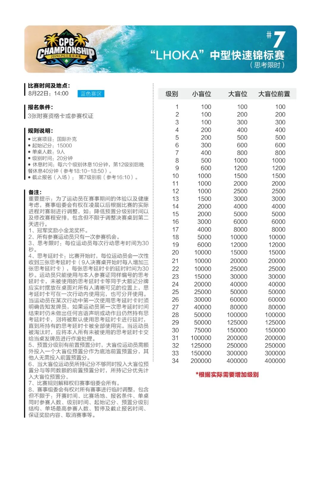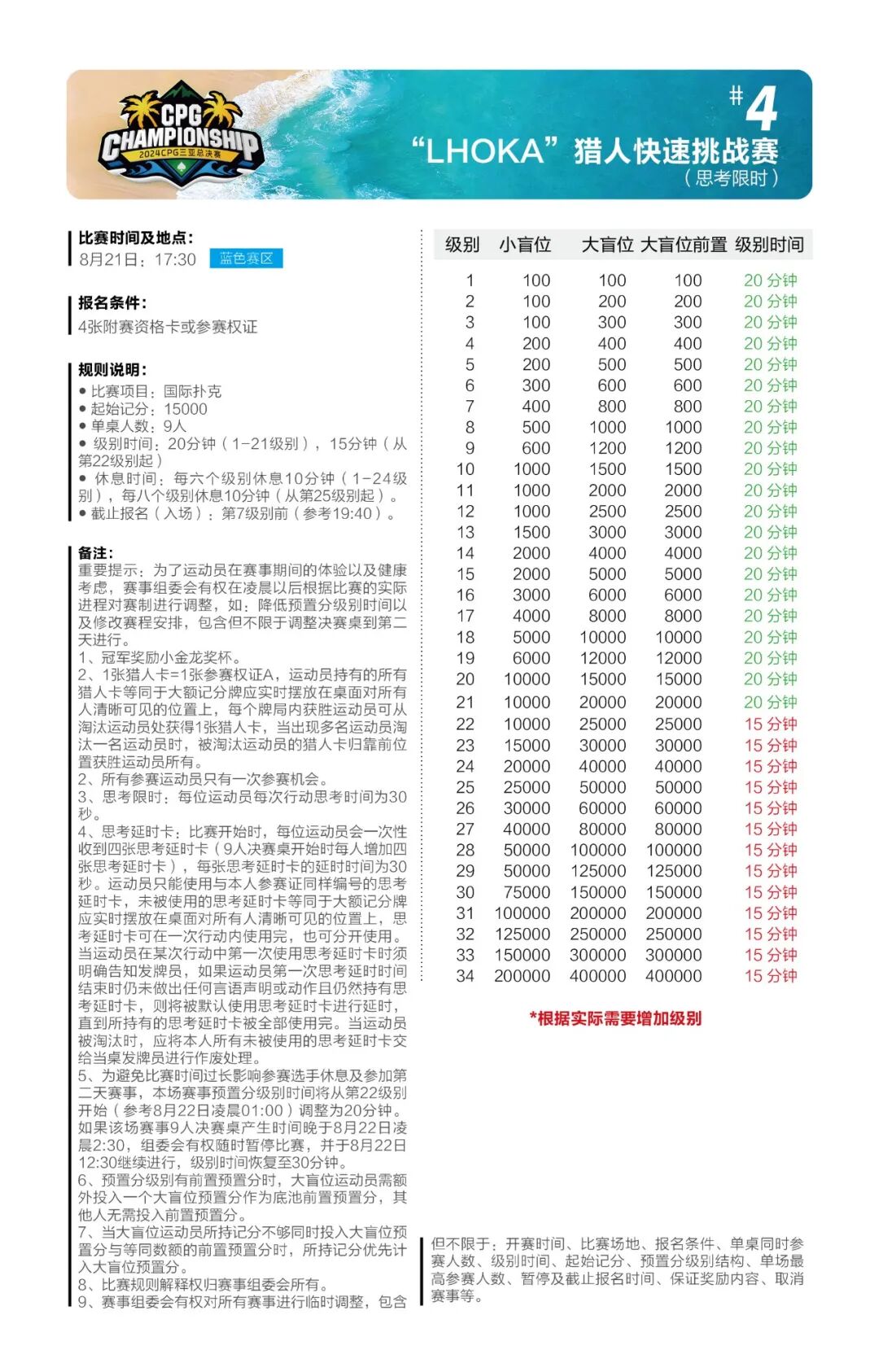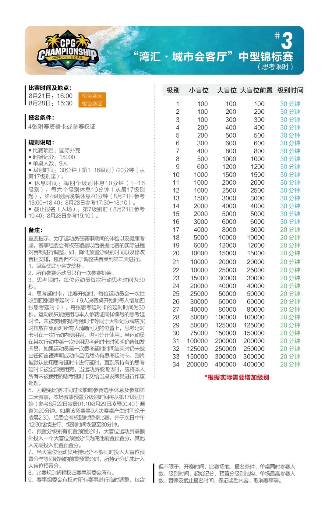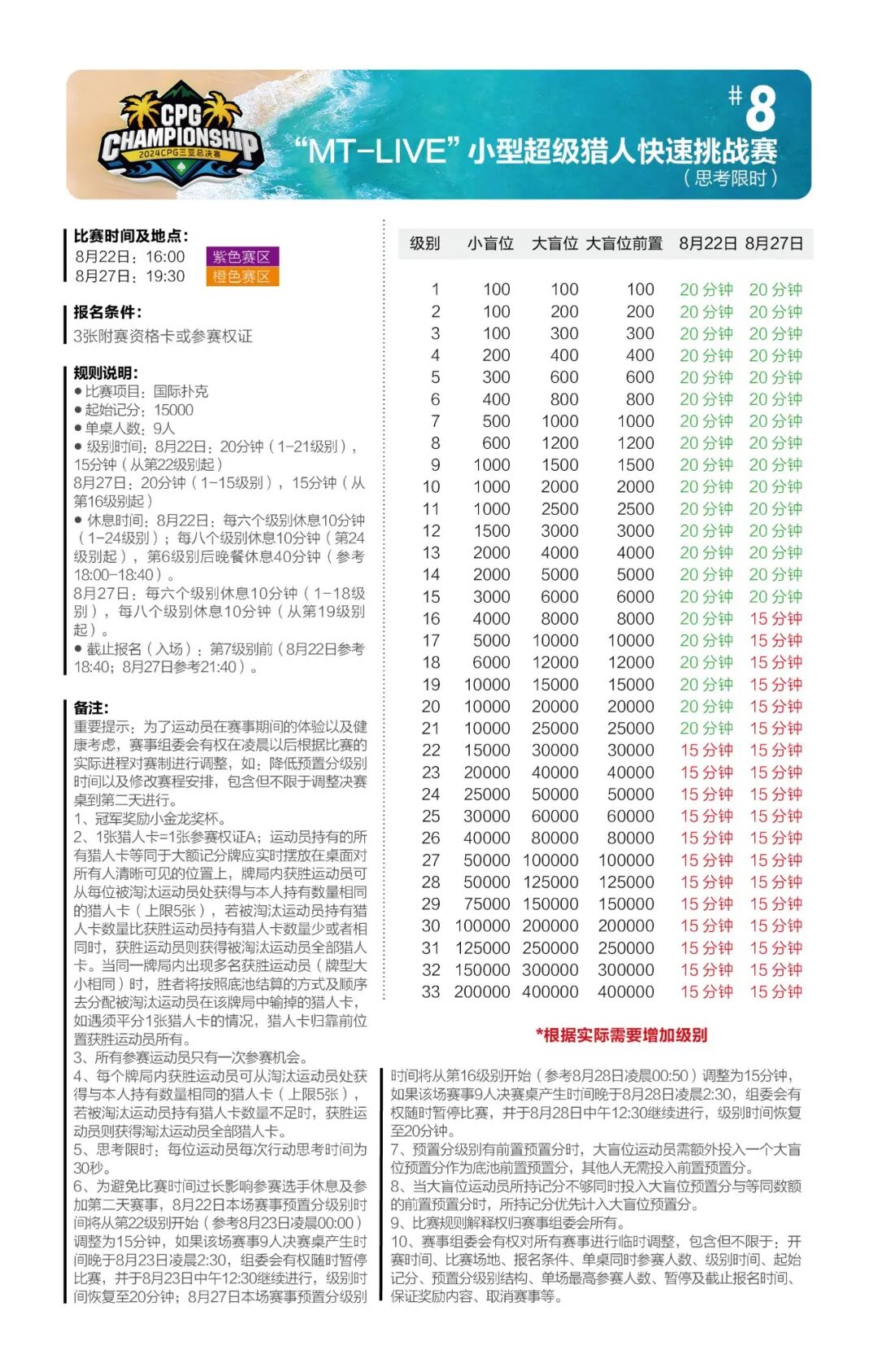 主赛总共将进行五轮比赛,第一轮共设A、B、C三个组别。为了让所有参赛运动员对本次比赛更加了解,做好充分的参赛准备,特此发布详细赛制。 主赛为期七天: 起始记分:30000 8月24日为第一轮A组比赛,级别时间为60分钟,进行10个级别后结束; 8月25日为第一轮B组比赛,级别时间为60分钟,进行10个级别后结束; 8月26日为第一轮C组比赛,级别时间为60分钟,进行10个级别后结束; 8月27日为第二轮比赛(思考限时),级别时间为60分钟,进行