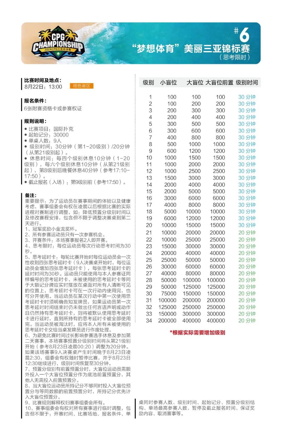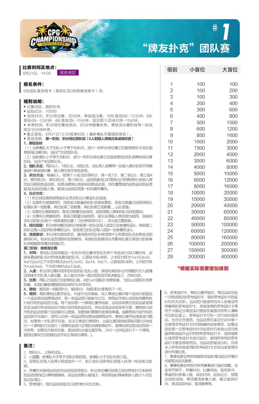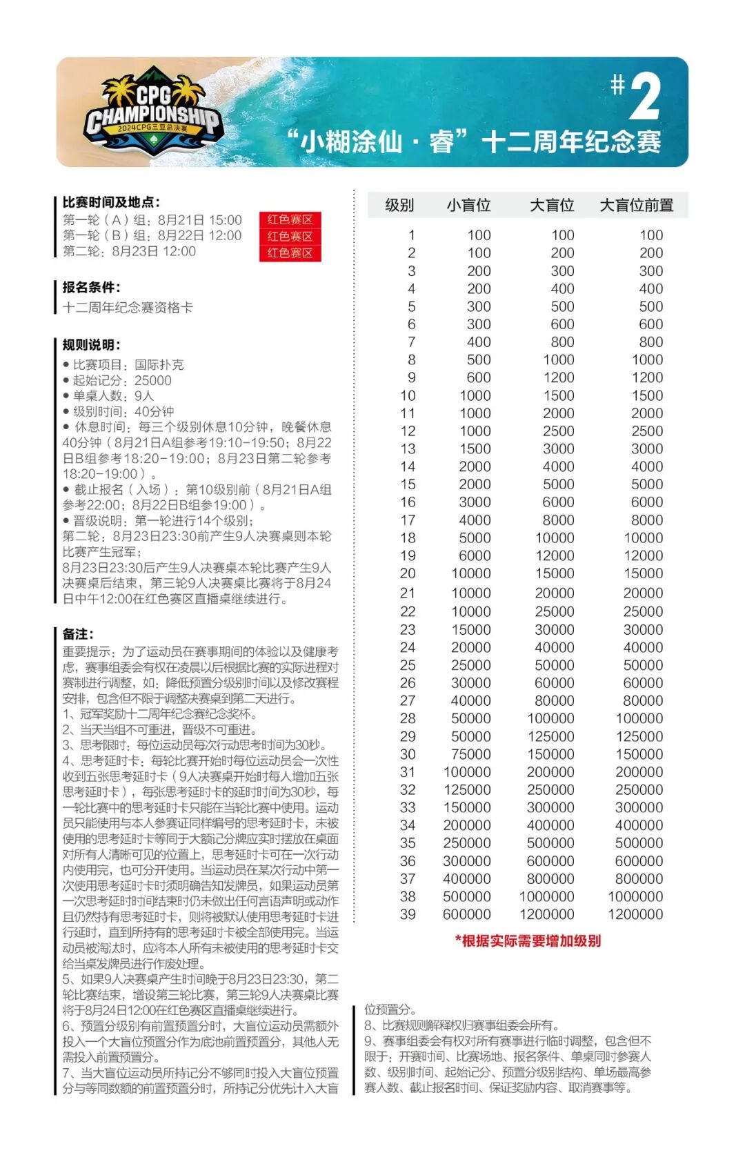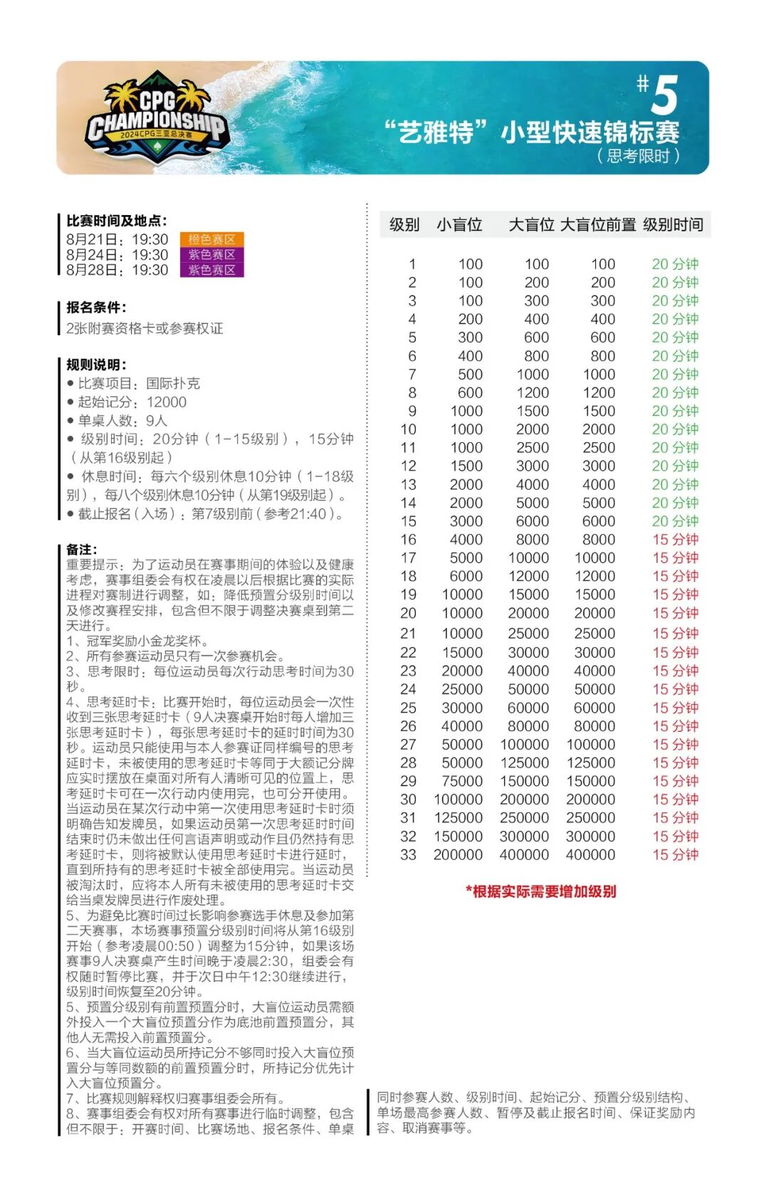 主赛总共将进行五轮比赛,第一轮共设A、B、C三个组别。为了让所有参赛运动员对本次比赛更加了解,做好充分的参赛准备,特此发布详细赛制。 主赛为期七天: 起始记分:30000 8月24日为第一轮A组比赛,级别时间为60分钟,进行10个级别后结束; 8月25日为第一轮B组比赛,级别时间为60分钟,进行10个级别后结束; 8月26日为第一轮C组比赛,级别时间为60分钟,进行10个级别后结束; 8月27日为第二轮比赛(思考限时),级别时间为60分钟,进行